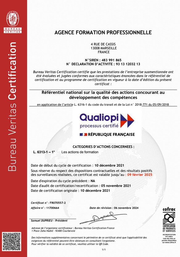 Bienvenue au sein de l'Agence Formation Professionnelle, certifiée Qualiopi pour vous assurer une qualité inégalée dans nos services de formation.